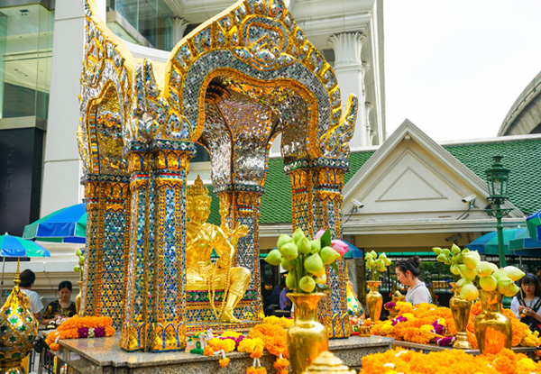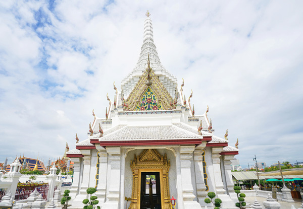 四面佛,并在专人指导下给佛像贴金,为自己及家人祈求平安吉祥,参拜结束返回曼谷,途径休息站后前往前往东南亚最大的