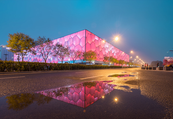 近观2008年奥运主会场鸟巢和水蓝色梦幻游泳馆水立方外景,您可下车拍照留念。