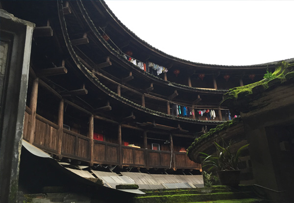 15:00 参观最精美双环圆土楼——怀远楼此楼建于清宣统元年(1909 年),至今保存完好,文化底蕴深厚,是国家级重点文物保护单位,目前已被列入世界文化遗产名录。楼墙虽然只是普通夯土墙,但是夯筑技术炉火纯青,历经近百年的风雨侵袭,至今一片光滑,几乎没有剥落,让你感觉到时间只是从墙上轻轻划过,而没有留下痕迹。