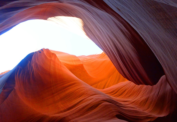 羚羊峡谷+鲍威尔湖+马蹄湾,羚羊峡谷(约1小时)如同其他狭缝型峡谷般,是柔软的砂岩经过百万年的各种侵蚀力所形成。主要是暴洪的侵蚀,其次则是风蚀。该地在季风季节里常出现暴洪流入峡谷中,由于突然暴增的雨量,造成暴洪的流速相当快,加上狭窄通道将河道缩小,因此垂直侵蚀力也相对变大,形成了羚羊峡谷底部的走廊,以及谷壁上坚硬光滑、如同流水般的边缘。