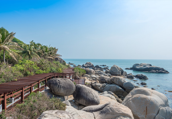 天涯海角(游览时间不少于150分钟)海南5A级旅游风景区,是海南旅游的第一品牌代表。以美丽迷人的热带海滨自然风光、悠久独特的历史文化而驰名中外。这里碧海、青山、白沙、巨磊、礁盘浑然一体,椰林、波涛、渔帆、鸥燕、云霞辉映点衬,形成南国特有的椰风海韵。