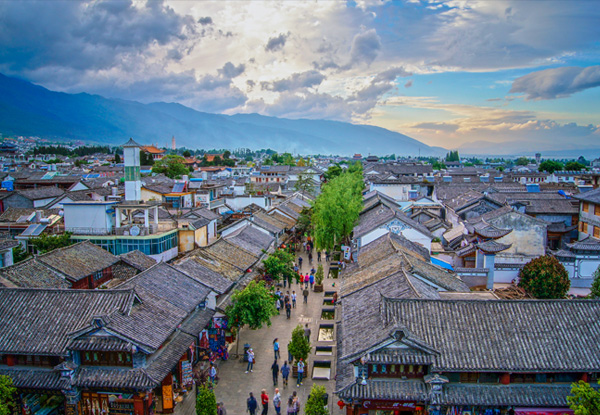 大理古城:始建于明洪武十五年,又名叶榆城、紫禁城、中和镇,背靠苍山,面临洱海,形成了“一水绕苍山,苍山抱古城”的城市格局。古城建筑为清一色的青瓦屋面,古朴清雅。