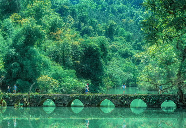 早餐后乘车前往中国喀斯特世界遗产——【小七孔景区】(游览时间3小时左右),抵达享用中餐后开始游览。小七孔在宽仅1公里、长12公里的狭长幽谷里,集洞、林、湖、瀑、石、水多种景观于一体,景外有景,景中有洞,洞中有景;林中有水,水中有林。这里富含负氧离子,是旅游界公认的一个“洗眼、洗心、洗肺”的好地方!景区内换乘电瓶车(40元/人,保险10元/人,费用需自理)游览主要景点:「卧龙潭」、「鸳鸯湖」、「古莱里欢乐谷」、「翠谷瀑布」、「水上森林」、「六十八级跌水瀑布」、「拉雅瀑布」、距今175年的「小七孔古桥」,以及通往广西的「铜鼓桥」。