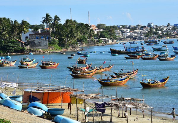 早餐后乘车前往越南东南海岸线著名的渔村及海滩渡假胜地-美奈(约4.5小时-5小时),天然幽美风景,令人有如处于世外桃源暂忘一切烦恼。抵达后参观Fairy stream仙女溪(约1.5小时),仙女溪是蜿蜒在红沙谷里的一条小溪,溪水清澈,赤脚走在溪水里,浅浅的水花刚好没过脚踝,踩在水里的脚底可以感受到沙石的细腻和溪水的清凉。我们逆流而上,在蓝天白云的映衬下,左岸红色的沙化山脊与右边成片的椰林稻田构成了一幅清新美丽的画卷。随后趁着黄昏时分,前往美奈最具盛名的渔村,美奈的渔村是相当出名的,不信你看看Lonely Planet的越南篇的封面就用的黄昏的美奈渔村就可见一斑。只见静静的港湾密密麻麻的停满了渔归的小船,暖暖的落日将余晖铺洒在海面上,整个小渔港笼罩在一层淡淡的、暖暖的金纱里。